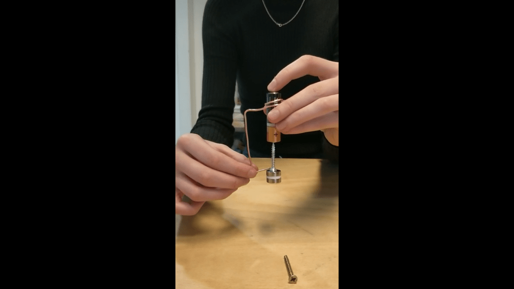 In dit experiment hebben we een vereenvoudigde versie van een elektromotor gemaakt met een batterij, een koperdraad, een schroef en een magneet. Dit was de basis voor ons uiteindelijke ontwerp.
